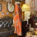 鮮やかながらも深みのあるオレンジの地に、流れるような流水文様と可憐な小花が描かれた、エネルギー溢れるワンピースです。