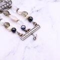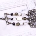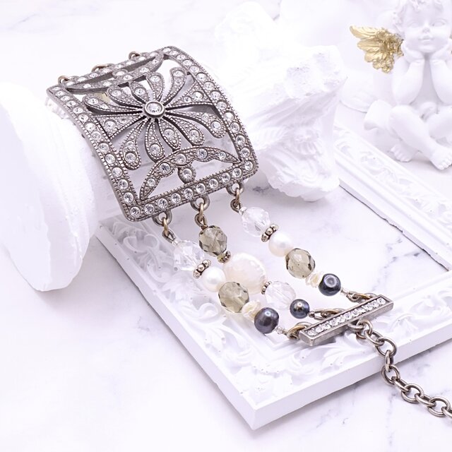 両サイドにはパール調ビーズやスモーキーカラーのガラスビーズが連なり、異素材の組み合わせが奥行きのある表情を生み出しています。