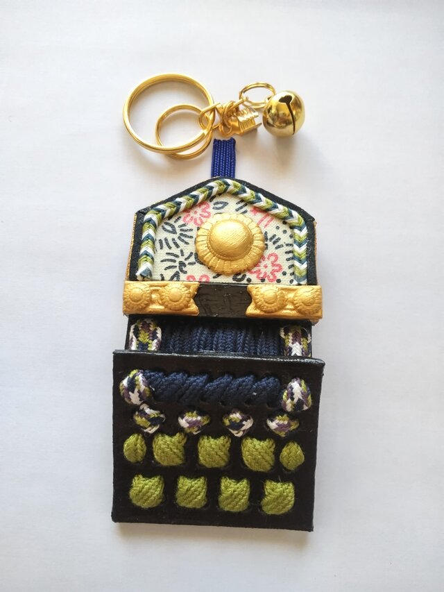 八犬伝をテーマにしたストラップで、敵の攻撃から身を守る武具を模したデザイン。