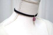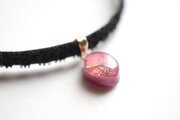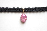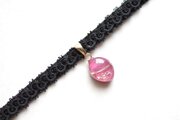 艶やかなローズピンクのマーキス型にゴールドの装飾を施したレジンを、ベルベットリボンにタティングレースで装飾を施したチョーカーに仕上げました。