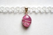 艶やかなローズピンクのマーキス型にゴールドの装飾を施したレジンを、サテンリボンにタティングレースで装飾を施したチョーカーに仕上げました。