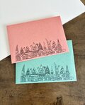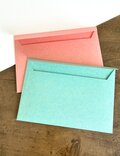 クラフト紙のような渋い色味の紙(スカーレット、ターコイズ)に、シンプルなモノクロ印刷でポストカードも入る洋2サイズの封筒です。