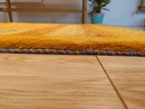このギャッベは、まるでシラーズの大地に降り注ぐ太陽をそのまま織り上げたような、見事な黄金色とオレンジのグラデーションが魅力です。