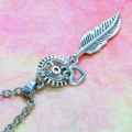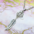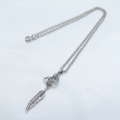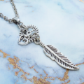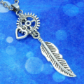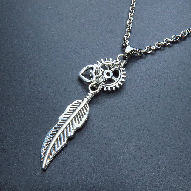 アンティークシルバー フェザーと歯車を組合せたスリムなネックレス スチームパンク風 ハート ステンレス可