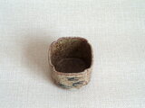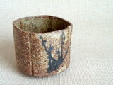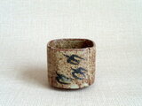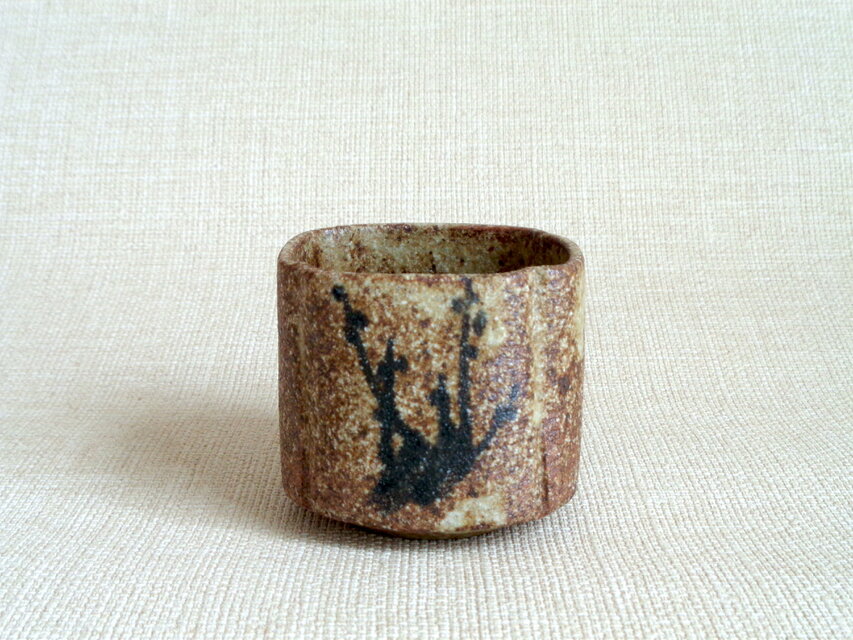 この湯のみは、粗目の信楽の土を用い成形時の土が柔らかいうちに四方に形作り、絵付けをして焼成を重ねて仕上げています。描く時に使用した鉄釉は、原材料を近くの田んぼから採取して自陶房で調合したものです。梅とつばめを一面ずつに描いています。素朴で温かみのある絵柄が映える味わい深い作品です。刺し身や酢の物などを入れる向付としてもお使いいただけます。
