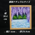 この油絵のサイズは縦272mm × 横242mm、額縁のナチュラルサイズは縦30.4cm × 横27.4cm × 厚さ0.9cmです。壁掛け用の金具が付属しているため、さまざまな場所に簡単に飾ることができ、「ネモフィラと藤の花」はリビングやオフィスなどでアートとしての存在感を発揮します。