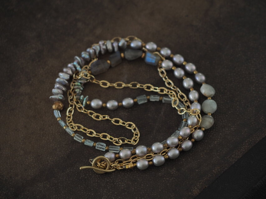 大好きなラブラドライト、アクアマリン、そしてパールで作ったネックレス。地味に見えるかもしれませんが、シックでいいなあ、と思うのです。