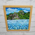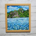 「青の洞窟のネモフィラ」は、大分県中津市本耶馬渓町曽木の青の洞門沿いに広がる、鮮やかな青いネモフィラ畑を描いた美しい油絵作品です。青空と白い雲、そして対岸に広がる田んぼとの鮮やかなコントラストが織り成す情景は、観る人の心に安らぎと感動をもたらします。自然の美しさが、あなたの生活空間に素敵な癒やしを加えてくれることでしょう。