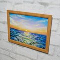 この油絵のサイズは横297mm × 縦210mm、額縁サイズは縦24.2cm × 横32.8cm × 厚さ1cmです。壁掛け用の金具が付属しているため、お好きな場所に手軽に飾ることができ、「夕日に輝くネモフィラ」はリビングや書斎、寝室などでアートとしての存在感を発揮します。
