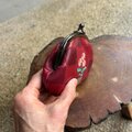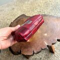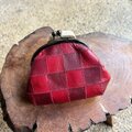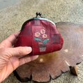 ワインレッド系の牛革に花の刺繍とパッチワークを施してがま口に仕立てました。