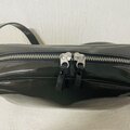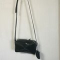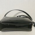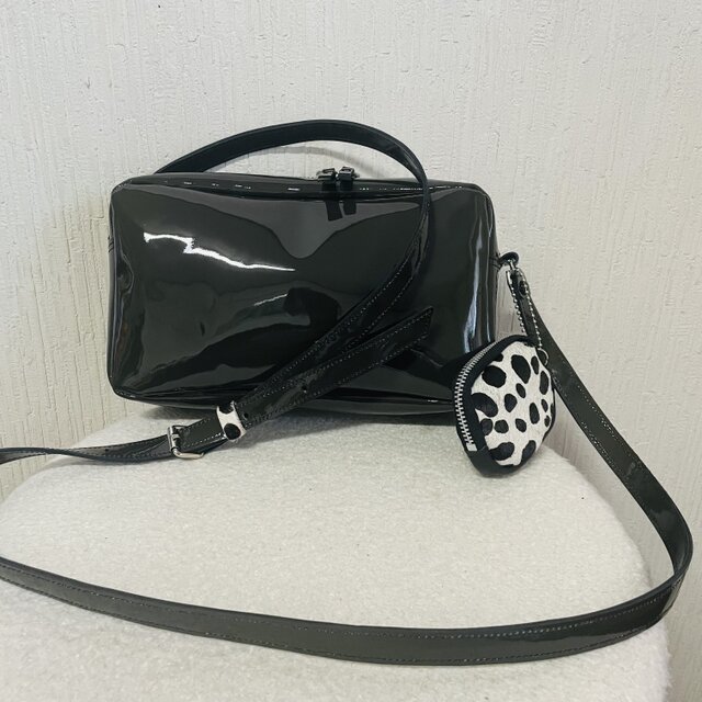 黒に近いチャコールグレーのパテントレザー(エナメル加工牛革)のショルダーバックです。少し横長目にして長財布も入るようにしました。