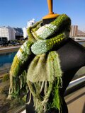 手織りのマフラーです。若草色をメインにスポーティーな感じにしたくて白と合わせておりました。太めの糸を使っています。ざっくりとした感じに仕立てました。幅は30センチ、長さは168センチ(房を含まず)、房10センチです。コートの下やセーターの首元など暖かく巻いてください。