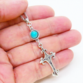 ロザリオの上部には空の色を閉じ込めたような瑞々しいターコイズをあしらい、落ち着いたシルバーのトーンに華やかさをアップさせました