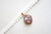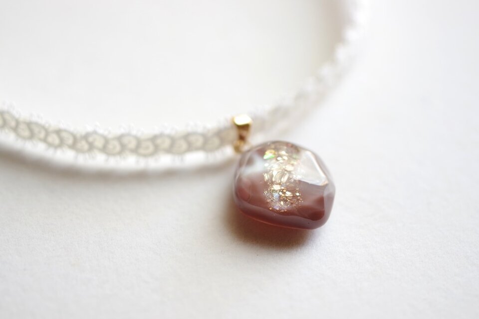 ブラウンとホワイトのマーブル模様と、きらめくラメが華やかで美しいレジンを、サテンリボンにタティングレースで装飾を施したチョーカーに仕上げました。
