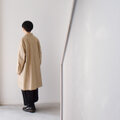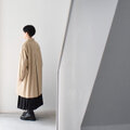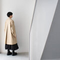サイズ感はゆったりめですが、サイドに脇マチを入れて立体的にし、後ろ身頃のタックは思い切って大きくすることで、胸の部分のゆとりを確保しつつ、前身頃の生地分量を前中心から裾に向かって外向きに斜めに削ることで、生地の流れを調整し、前身頃の裾に余分にフレアが出にくく、ゆとりはありながらも前面はスッキリと見えるようにデザインしています。