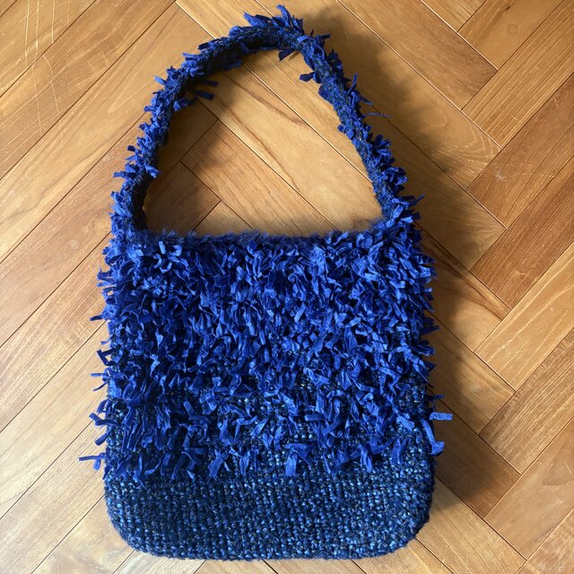 以前、このリボンヤーンが人気すぎて、何個も編みましたが、もうこの色も在庫がわずかとなり、もう一つワンショルダーのトートバッグを編みました。