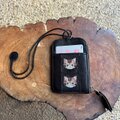 黒の牛革に茶トラ猫の刺繡を施し、パッチワークをして仕立て上げました。
