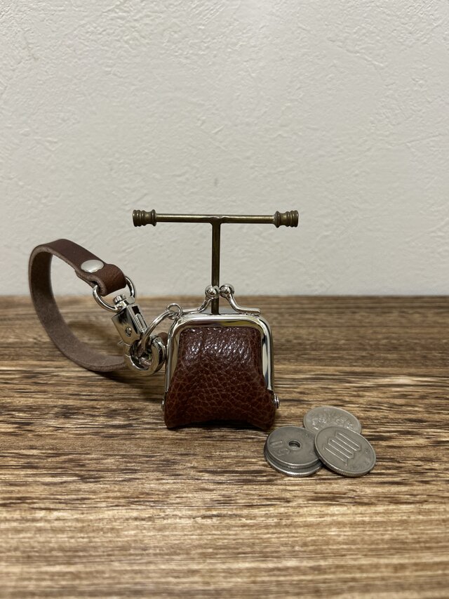 姫路レザーminiminiコインケース◆焦げ茶 革財布 キーホルダー 小物入れ バックチャーム がま口