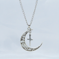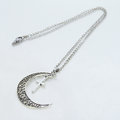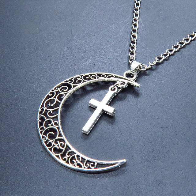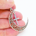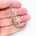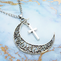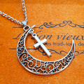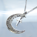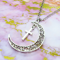 アンティークシルバー 透かし三日月とロザリオ(十字架)の大人可愛いネックレス ムーンネックレス ステンレス可