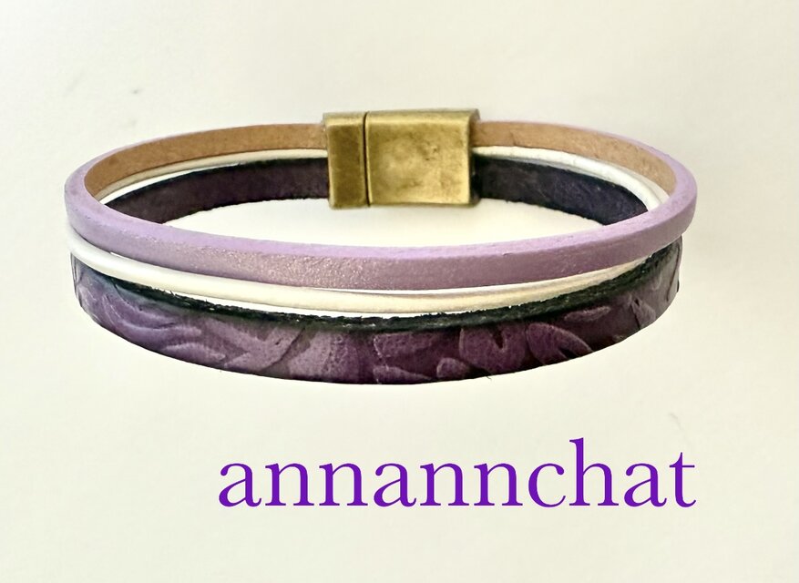 ヨーロッパ製 本革 ボタニカルな浮彫のバイオレット 紫、パールホワイト、ラベンダー の3色をあわせた 3連のブレスレットを作りました。