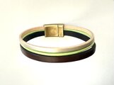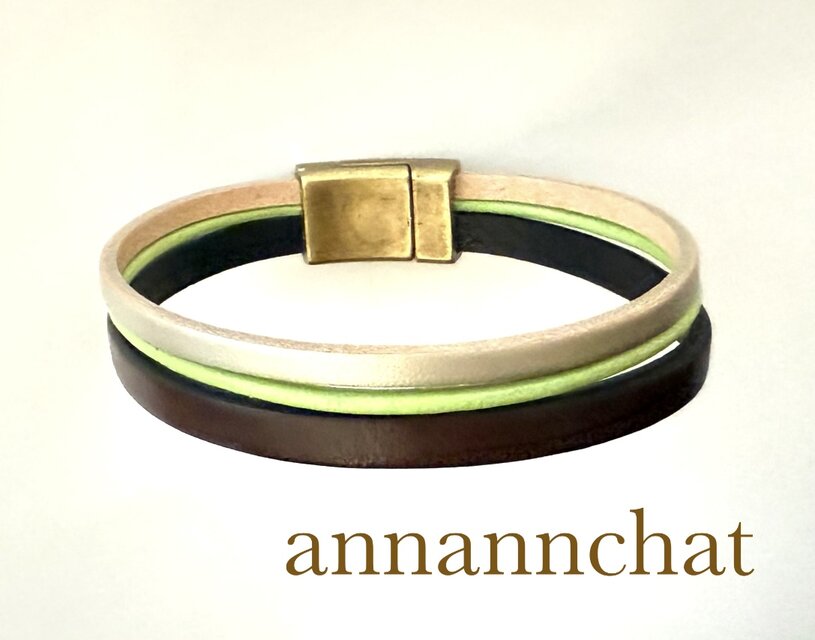 ヨーロッパ製 本革 チョコレートブラウン(濃茶 5㎜)・ピスタチオ・シャンパンゴール(3㎜)の3色をあわせた 3連のブレスレットを作りました。