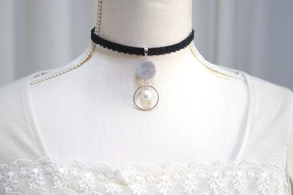 グレーのマーブル模様が美しいレジンを、ベルベットリボンにタティングレースで装飾を施したチョーカーに仕上げました。
