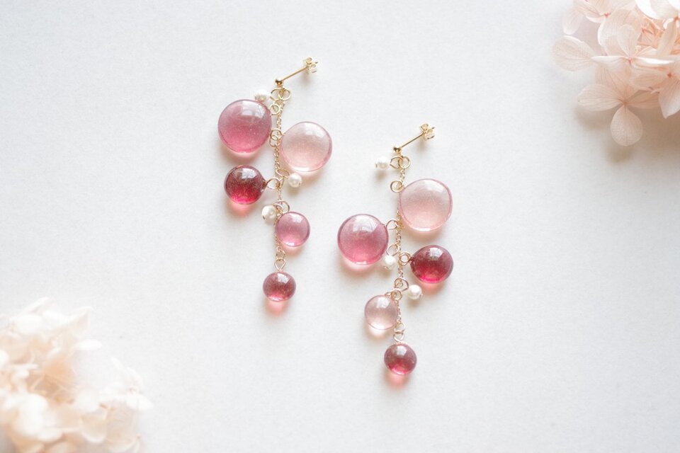大小のレジンのラウンドモチーフがまるで転がり落ちる水滴のようで、その透明感に思わず魅入ってしまうピアス。