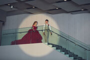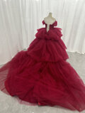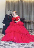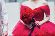 実例写真!カラードレス ビビッドピンク 花嫁 オフショルダー ビジュー ボリュームドレス 大人っぽい