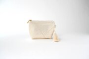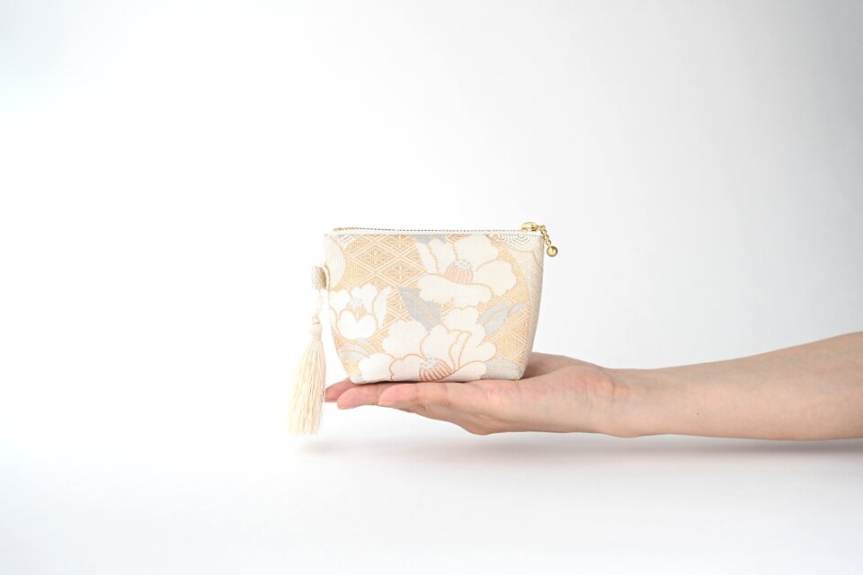 落ち着いたベージュに上品なシルバーが重なる、花丸模様のシルク帯を使って製作したミニポーチです。