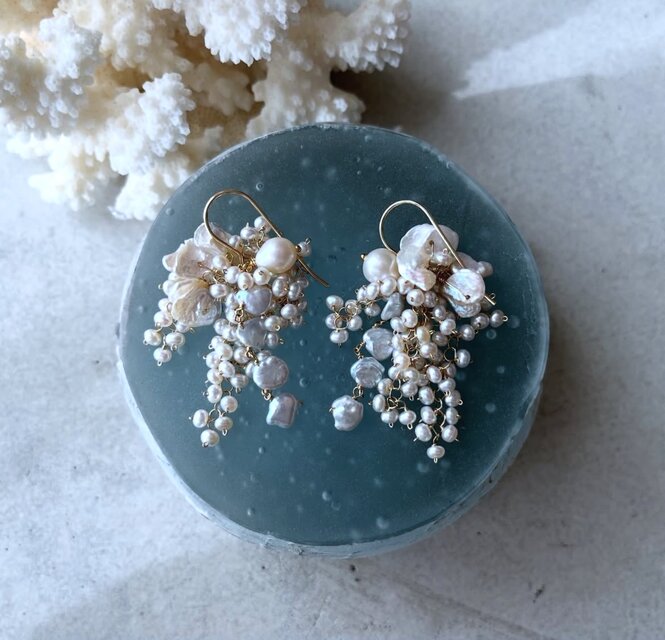 ふわふわ感やボリュームはそのままに様々な形のパールを重ね、より淡水パールの可憐さを楽しめるデザインにしました。