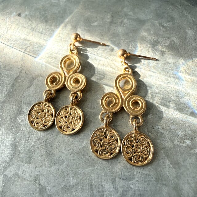 マットな質感のイエローゴールドトーンのスパイラルデザインが特徴的。程よいサイズ感で品よくまとまっています。