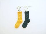 白いかわいいお花と、シンプルなお花を表現したくて靴下自体をみどりや黄色のカラーにしました。