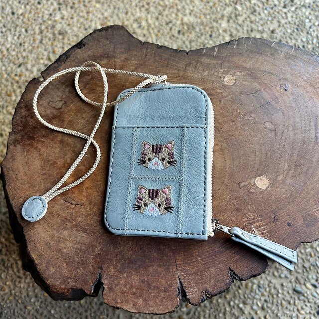 ライトグレーの牛革に茶トラ猫の刺繡を施し、パッチワークをして仕立て上げました。