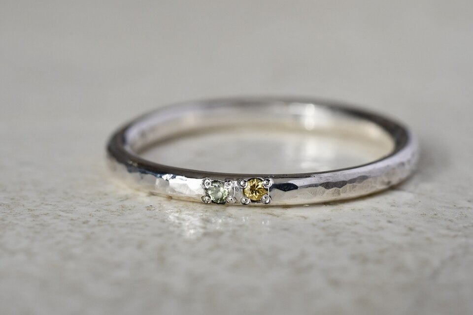今回はシルバーの槌目リングをベースにペリドットとイエローサファイアを組み合わせて制作を行いました。