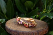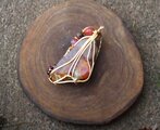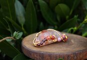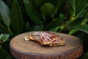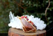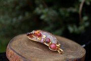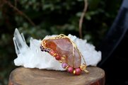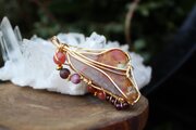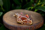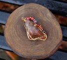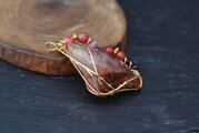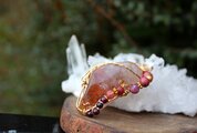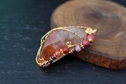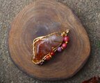 透明度が高く、艶もあり、内包物が美しいアンフィボールのタンブルです。ゴールドのワイヤーで巻いて、チューライト、ロードナイト、アンデシン、ガーネットのビーズをつけました。存在感があり、華やかな印象の作品になりました。