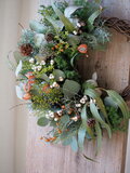 海からの潮風に葉を揺らす針葉樹やユーカリと、様々な木の実が織りなす、生命力あふれる瀬戸内の風景をリースに仕立てました。