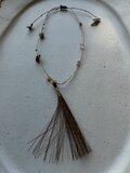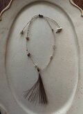 苧麻、麻、絹糸、アンティークガラスビーズ、水晶、スピネル、真鍮、蝋引き糸