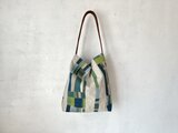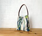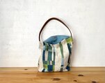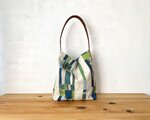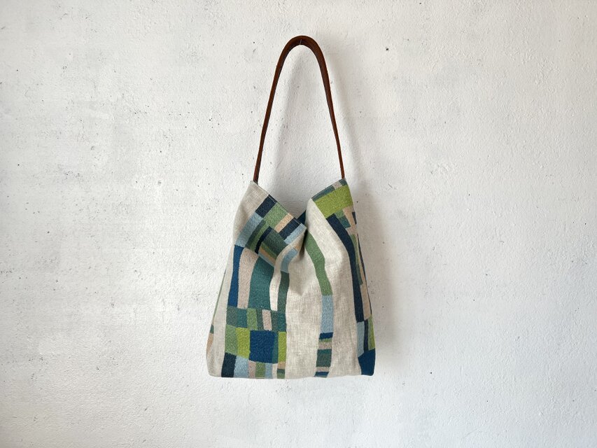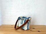 3色の綿糸でのステッチが とっても丁寧に 刺してあり 美しいデザインに! ヌメ革の持ち手が 個性的でインパクトあり 経年変化が 楽しみ。 コンパクトに くったりなるので 使い勝手が良い。