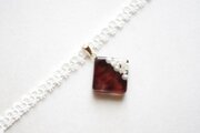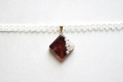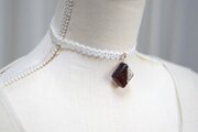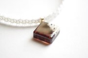 パールとお花を封じ込め、ブラウンとブルーグレーで着色したスクエア型のレジンを、サテンリボンにタティングレースで装飾を施したチョーカーに仕上げました。