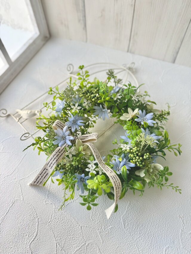 夏のリースが欲しくて購入させていただきました。写真で見た通り青く涼しげなお花のリース、手に取ることができて嬉しいです。お取引もスムーズでした。