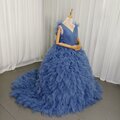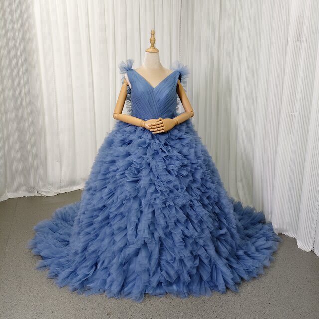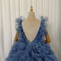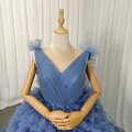 フランス風 カラードレス ブルー Vネック 背中見せ もこもこドレス 柔らかく重ねたチュールスカート 前撮り