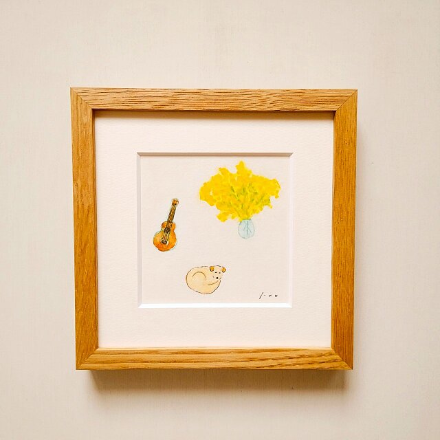 「ミモザと犬とウクレレ」原画 ※木製額縁入り(18㎝角)一点物 水彩 イラスト 北欧インテリア