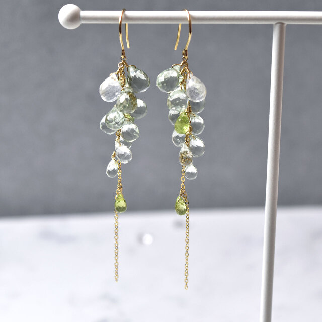 透明度の高い「グリーンアメジスト」をふんだんに使用し、光を纏うようなピアスに仕立てました。