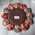 丸く裁断した布を1つずつ縫い縮めてお花のようにしたものを、サークルマットに12個縫い付けてあります。