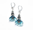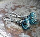 セルリアンブルーハンドメイドフラワーと多彩シルバービーズ、隠しブルービーズのピアス