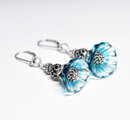 セルリアンブルーハンドメイドフラワーと多彩シルバービーズ、隠しブルービーズを繋いだピアスです・