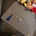 星屑のような煌めきを持つ紫金石をあしらった、幻想的なデザインの帯飾りです。ネイビーの石と、銀色のパーツがクールな印象。中心で輝く透明感のある大粒のクラッククリスタルが、ダークトーンの装いに光のアクセントを加えます。紺や黒等、モノトーンコーデに。知性を引き出し、自信を与えてくれる、凛とした美しさを放つ逸品です。
