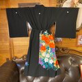 漆黒に、赤、紫、オレンジ、そして若草色の色彩が踊る、圧倒的な華やかさを持つ黒留袖リメイクです。