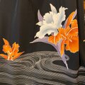 気高く咲く大輪の百合と、たおやかな流水紋が描かれた、大人っぽく洗練された一着です。オレンジと白のユリが、漆黒の宇宙に浮かび上がるような幻想的な意匠。派手さを抑えた色使いがとても素敵です。「歩く姿は百合の花」という言葉通り、しなやかな正絹が動くたびに美しく揺れます。落ち着いた中にも確かな華やぎを求める、大人のための勝負ドレスです。