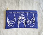 リネン生地にフランス製綿糸で靴の刺繍をしたマチなしのフラットポーチです。